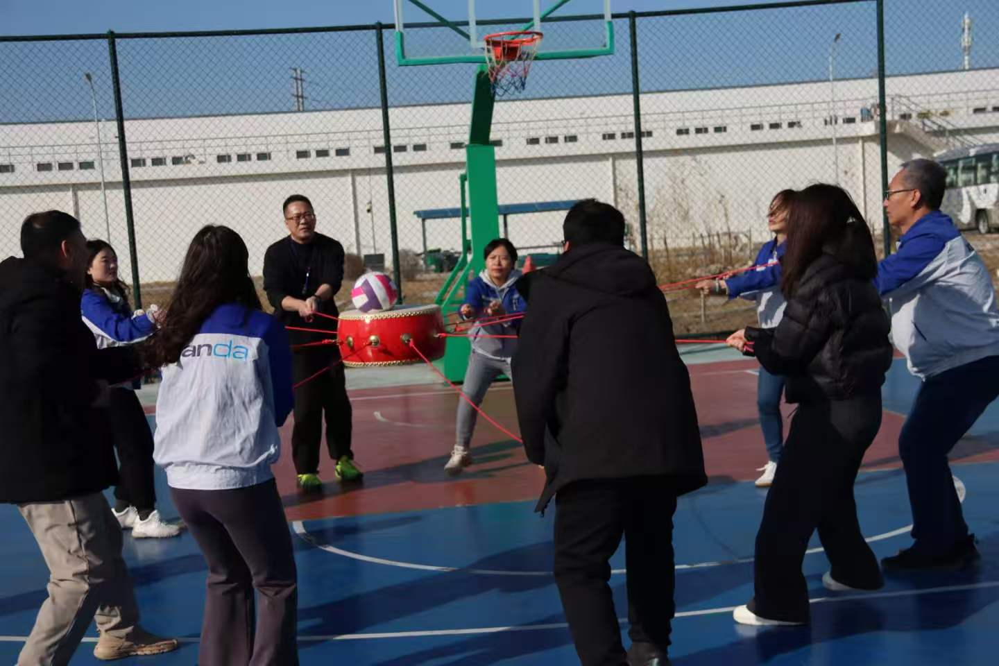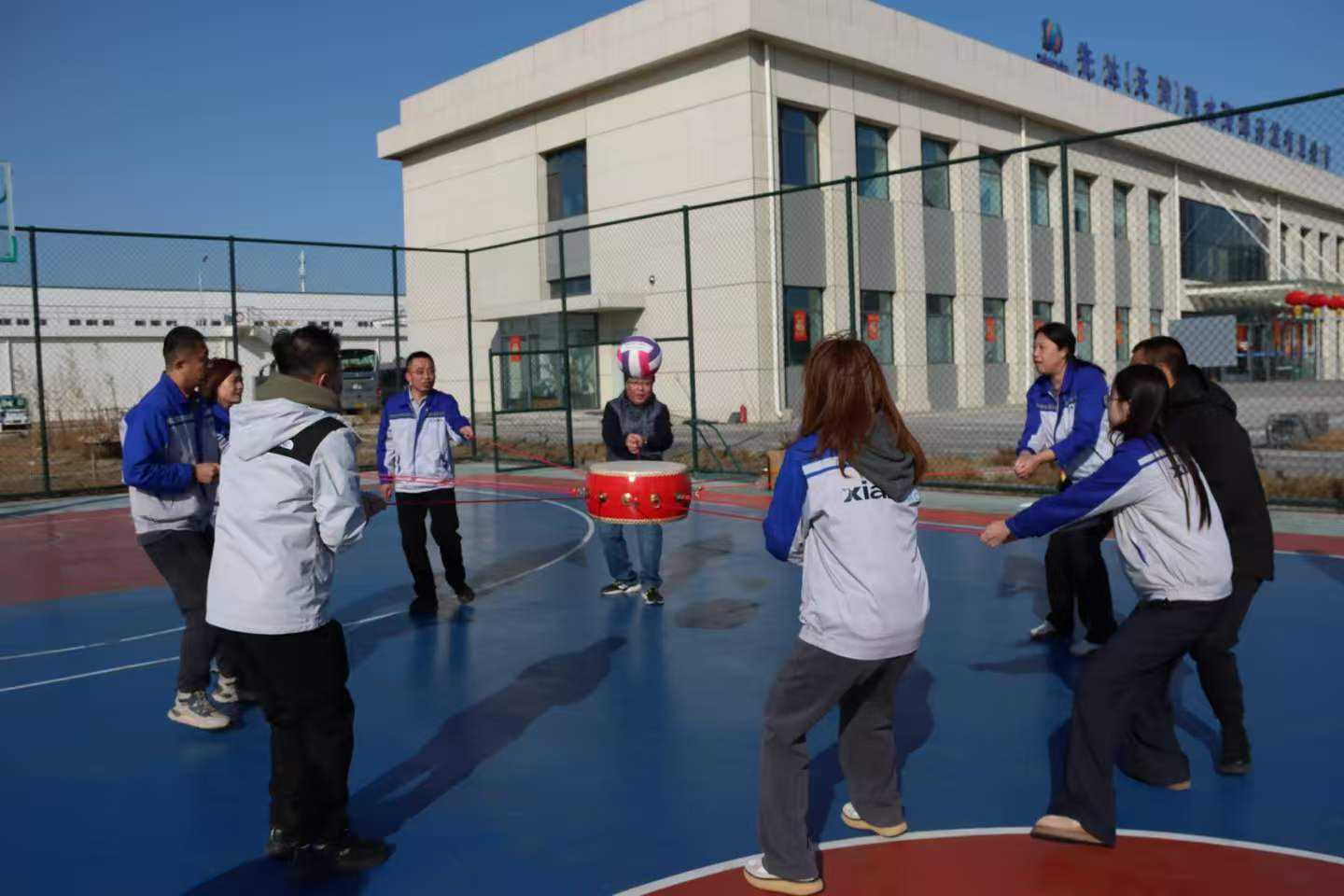 最后一个项目是鼓动人心游戏,作为考验团队协作的经典项目,它要求每一位队员拉住鼓边的绳子,齐心协力控制鼓面,让排球在鼓面上连续跳动,既需要专注的注意力,更需要全队步调一致的配合。比赛中,两队队员凝神聚力、齐声发力,听从指挥调整节奏,哪怕排球落地,也迅速调整状态重新开始,“稳住”“加油”的呐喊声此起彼伏,充分诠释了“不抛弃、不放弃”的团队精神。